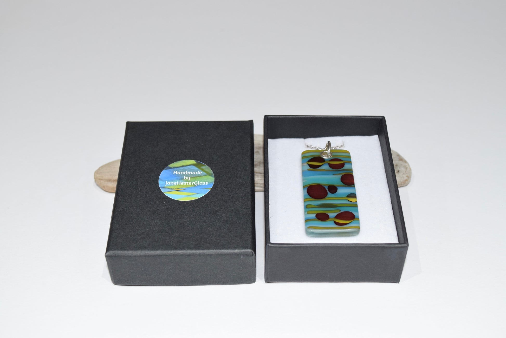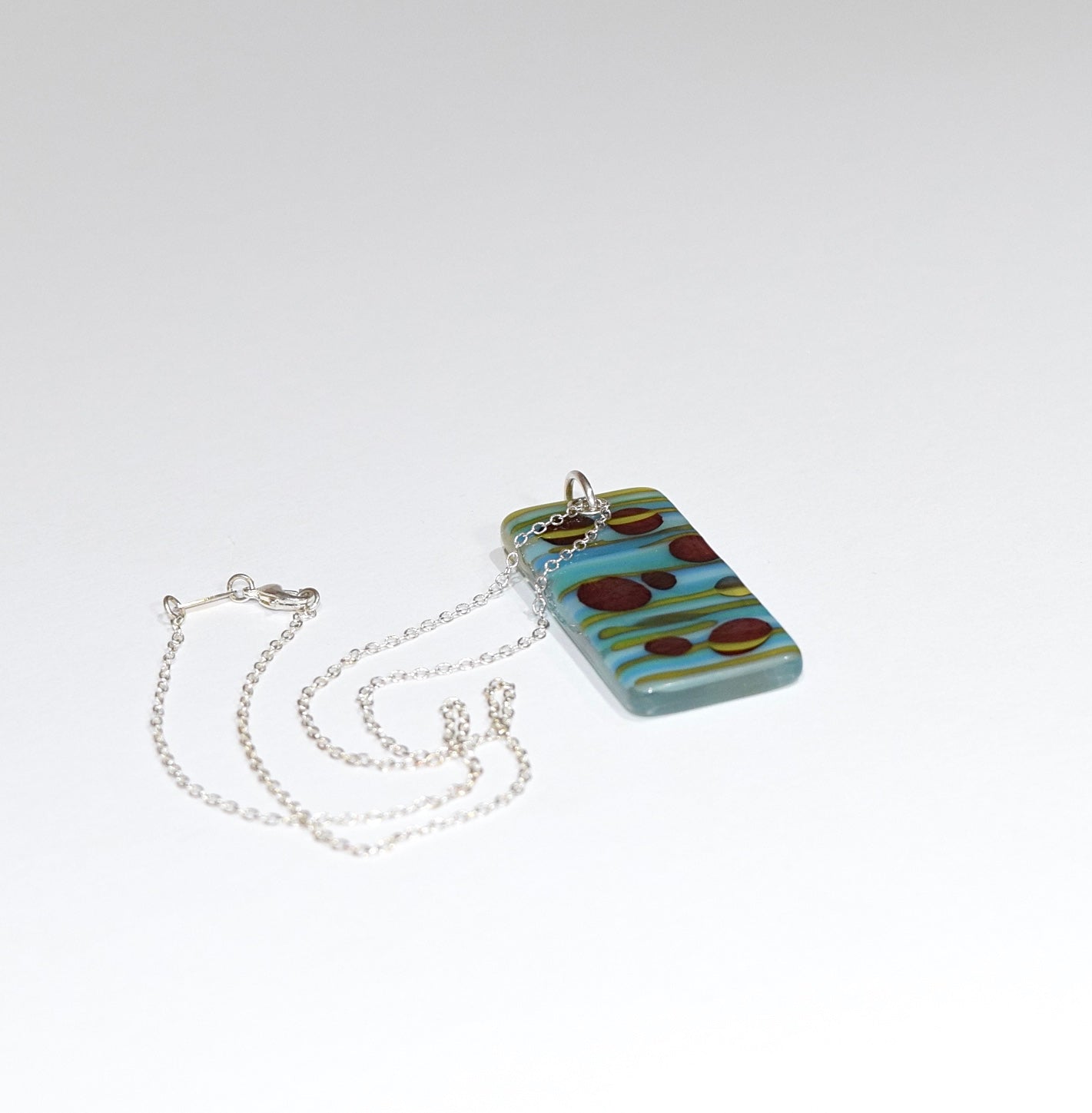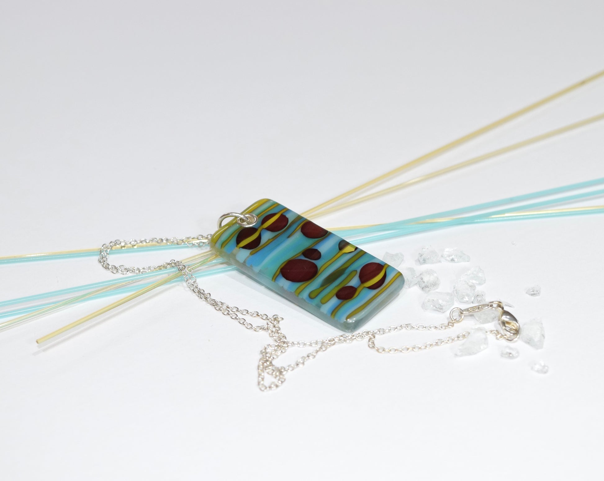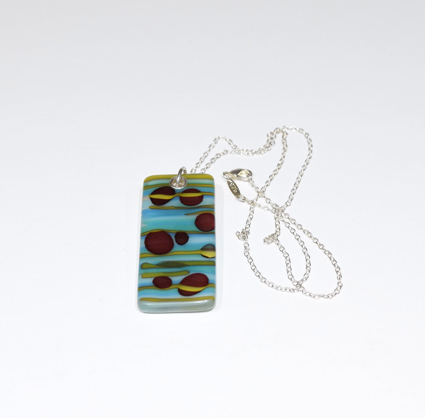 This oblong pendant was created using opal and transparent glass stringers in combination with reactive glass frit. The patterned glass was then cut and shaped by hand.