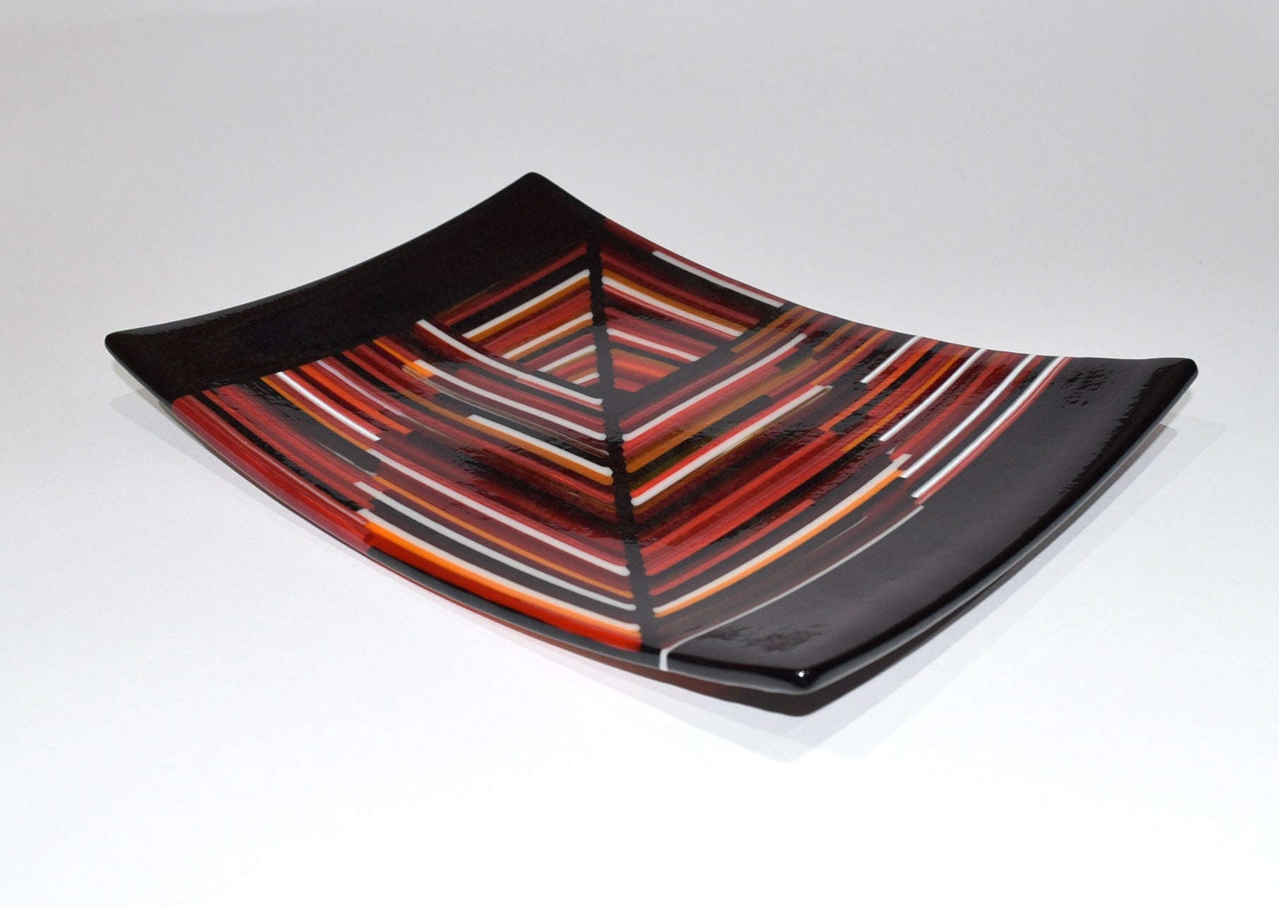 A lively mix of reds, oranges and black opal and transparent glass strips fused into a striking patterned dish.