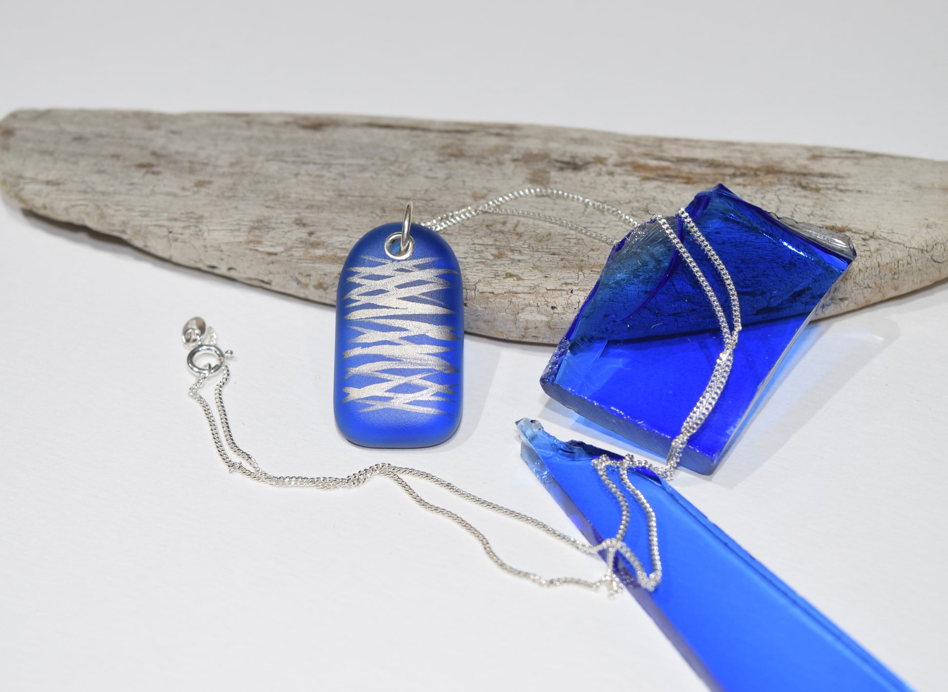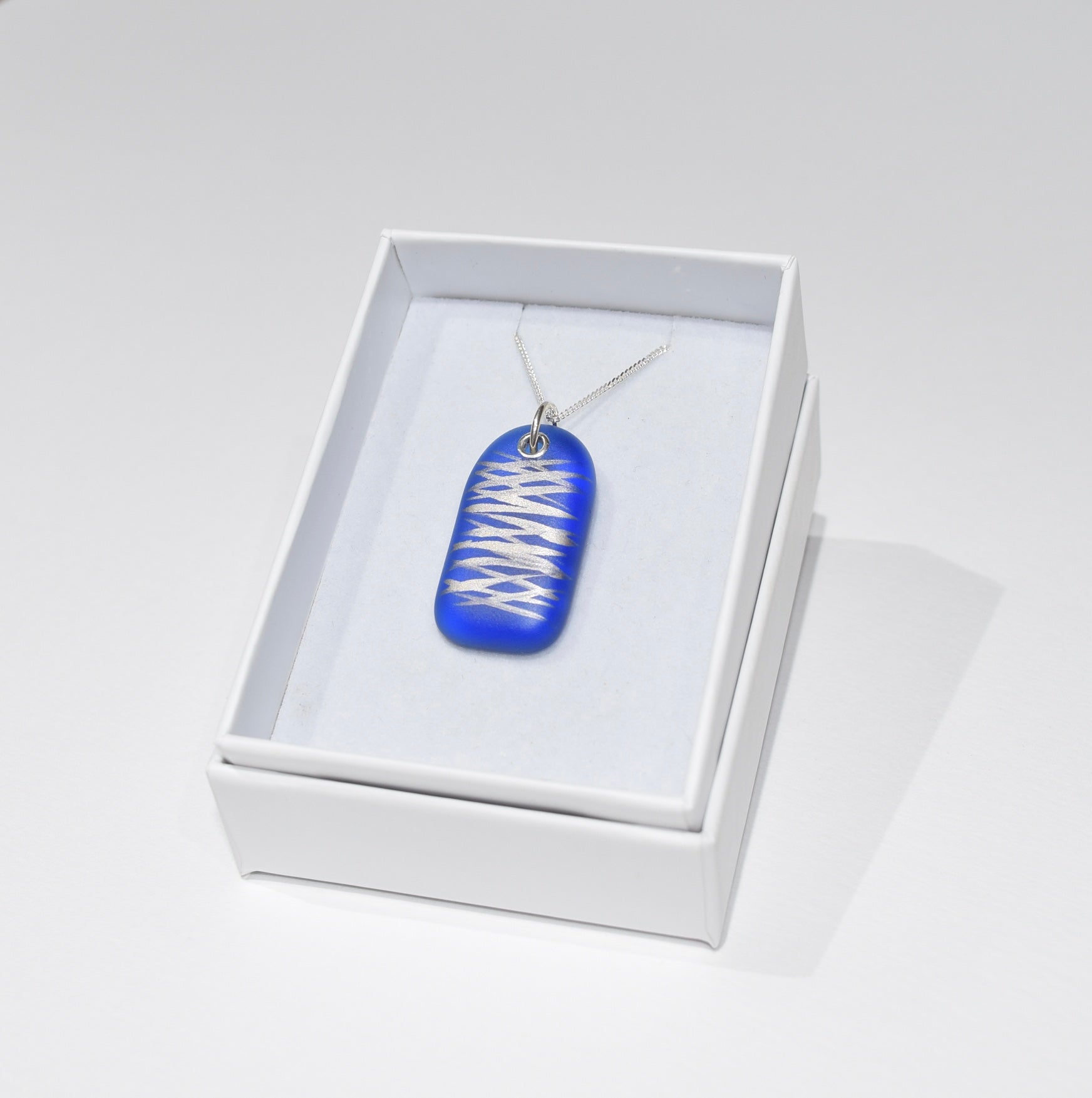 This blue glass pendant is semi-opaque and has a smooth low sheen finish. It is hand decorated with platinum lustre which is then fused onto the glass; designs vary and each pendant is unique.