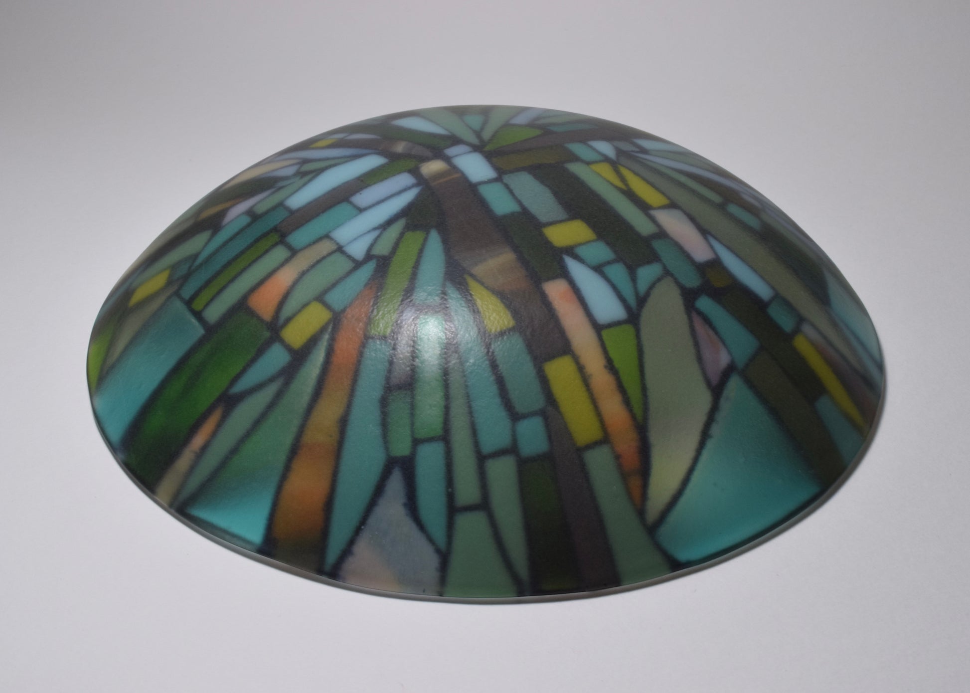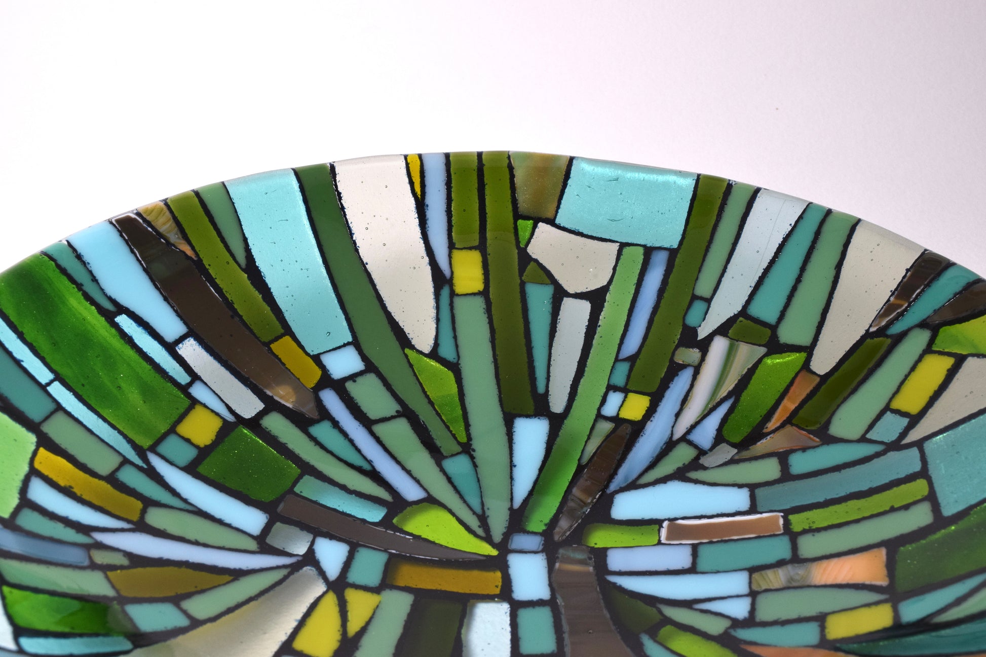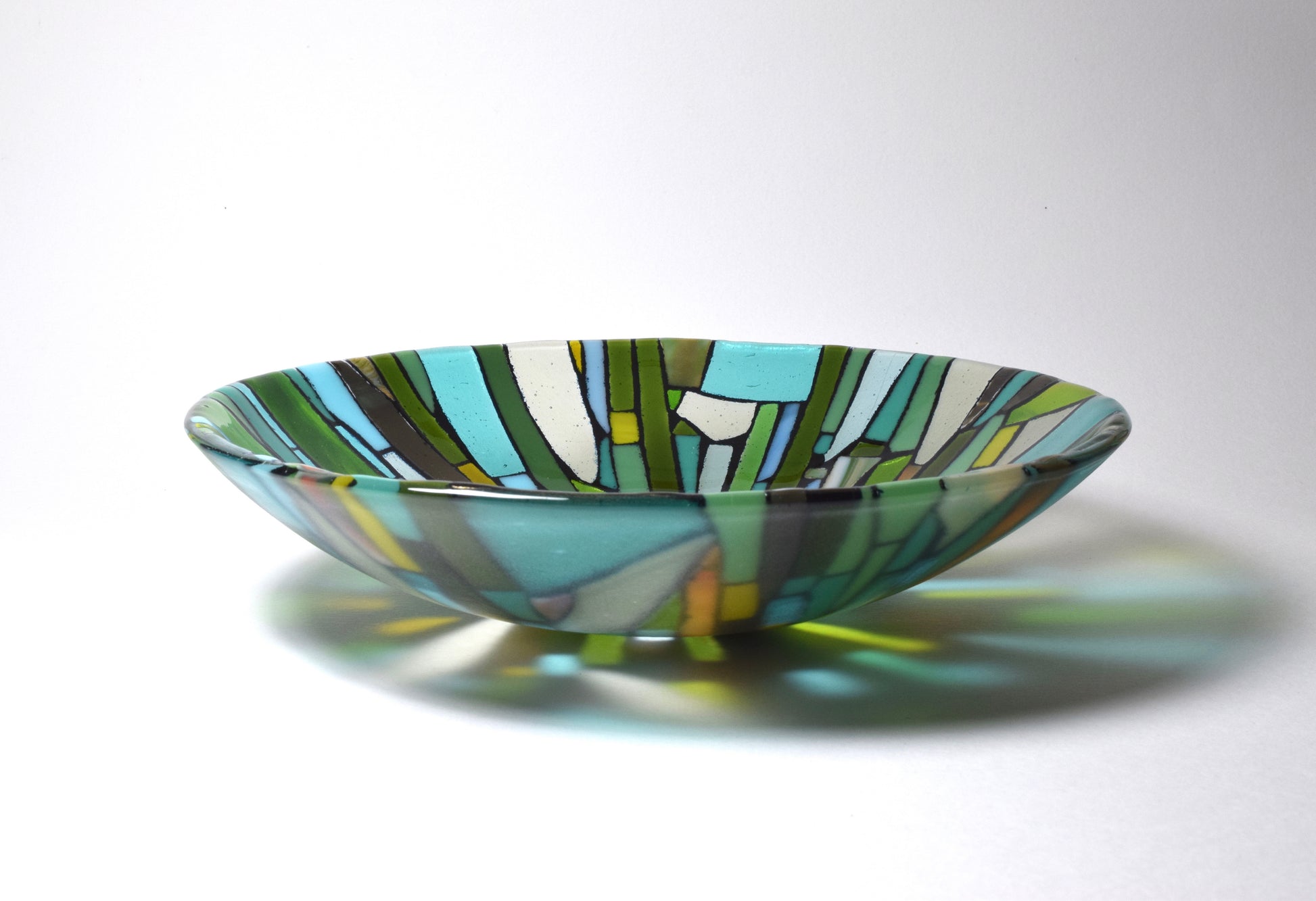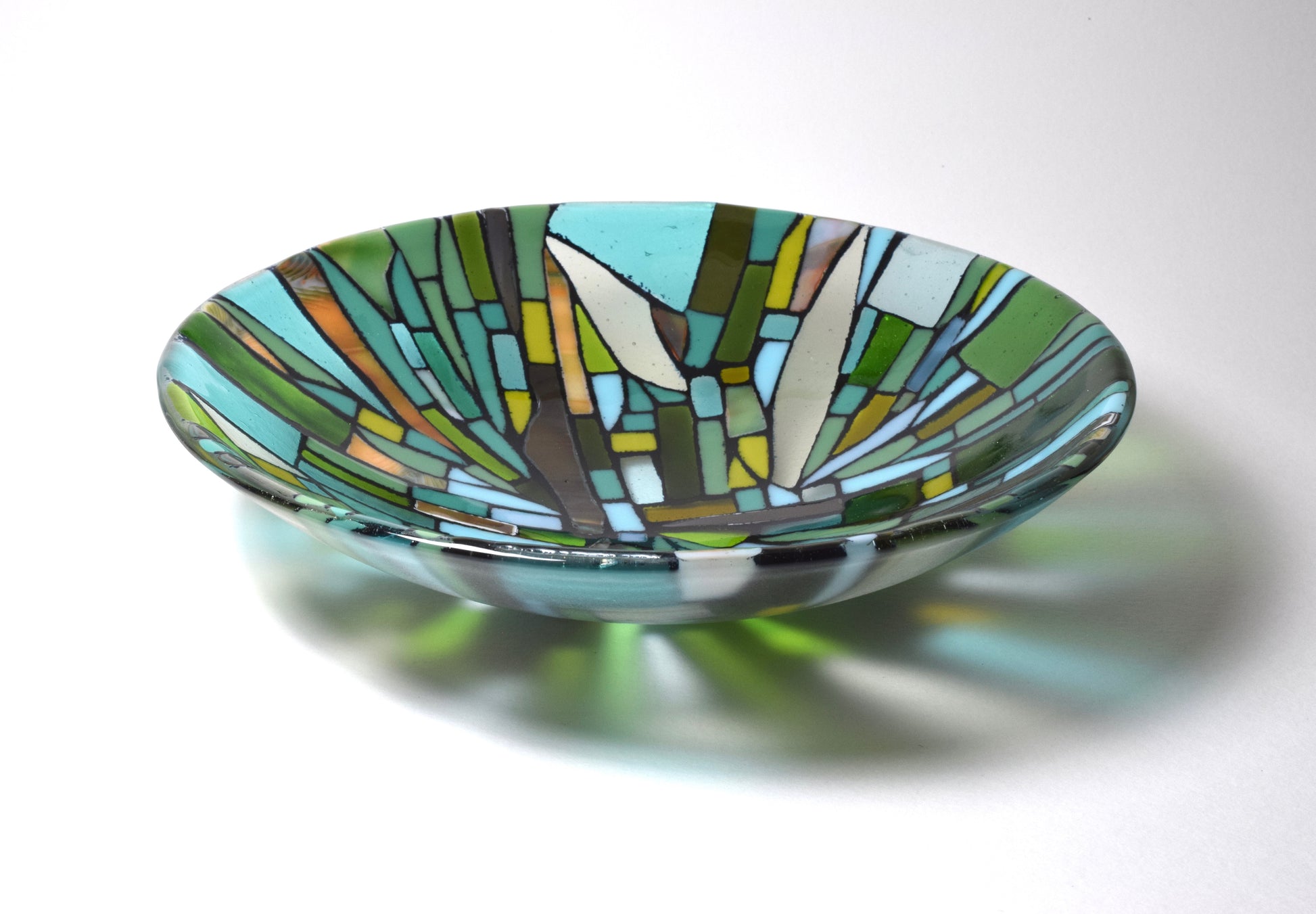 A patchwork of greens, this bowl is made from opal and transparent glass fused into a handy sized round bowl.