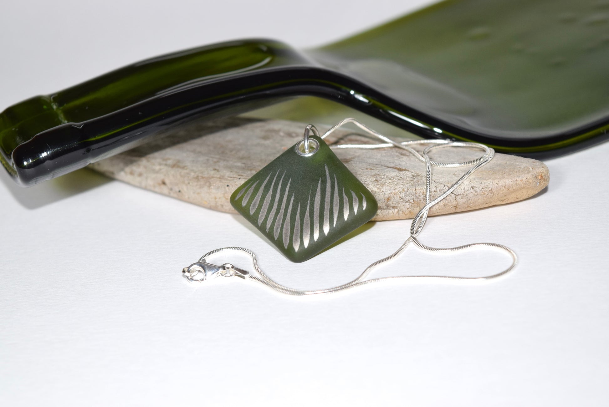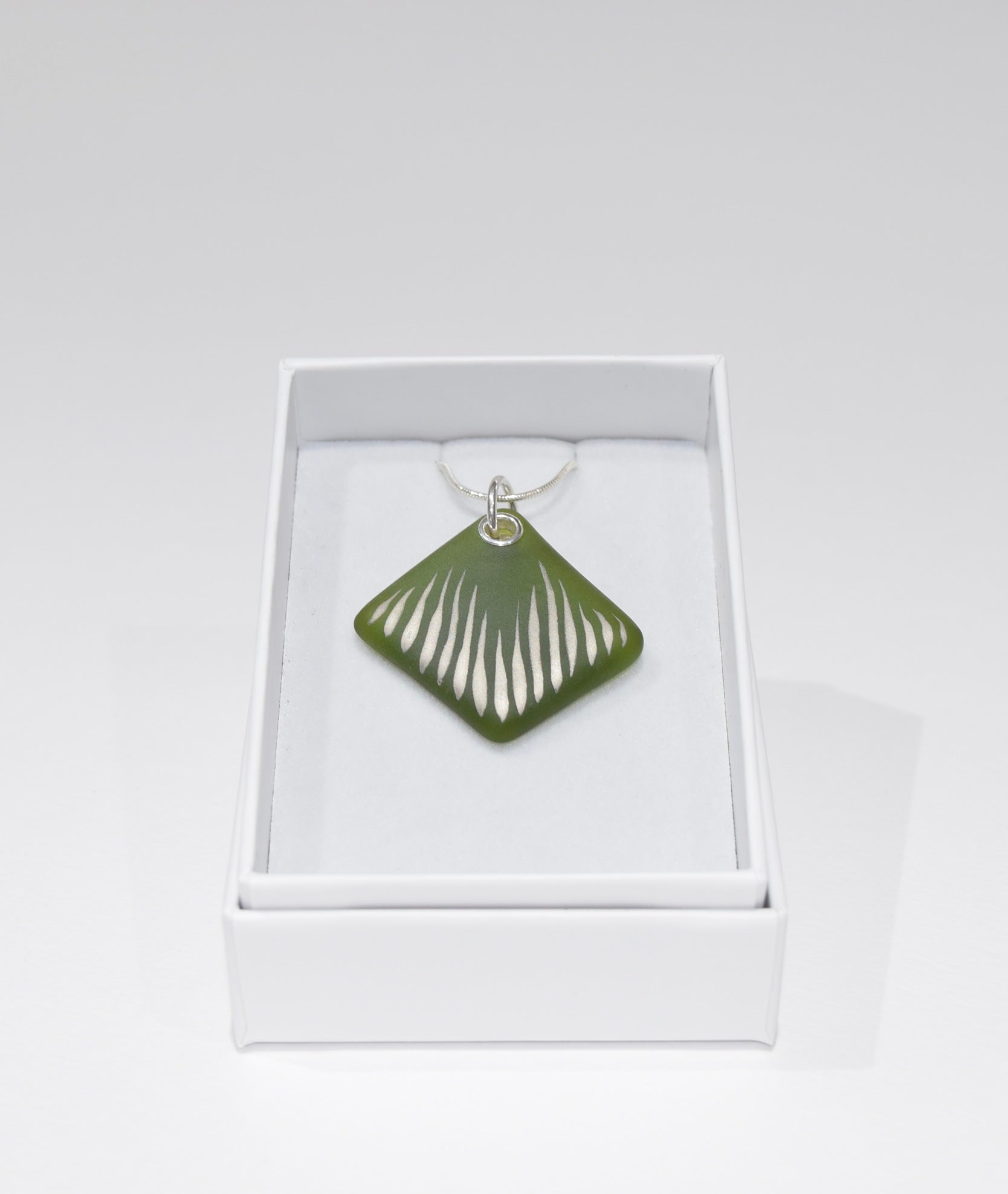 An unusual shaped lightweight olive green pendant, it is semi-opaque and the surface is a smooth satin finish. It is hand decorated with platinum lustre which is then fused onto the glass.