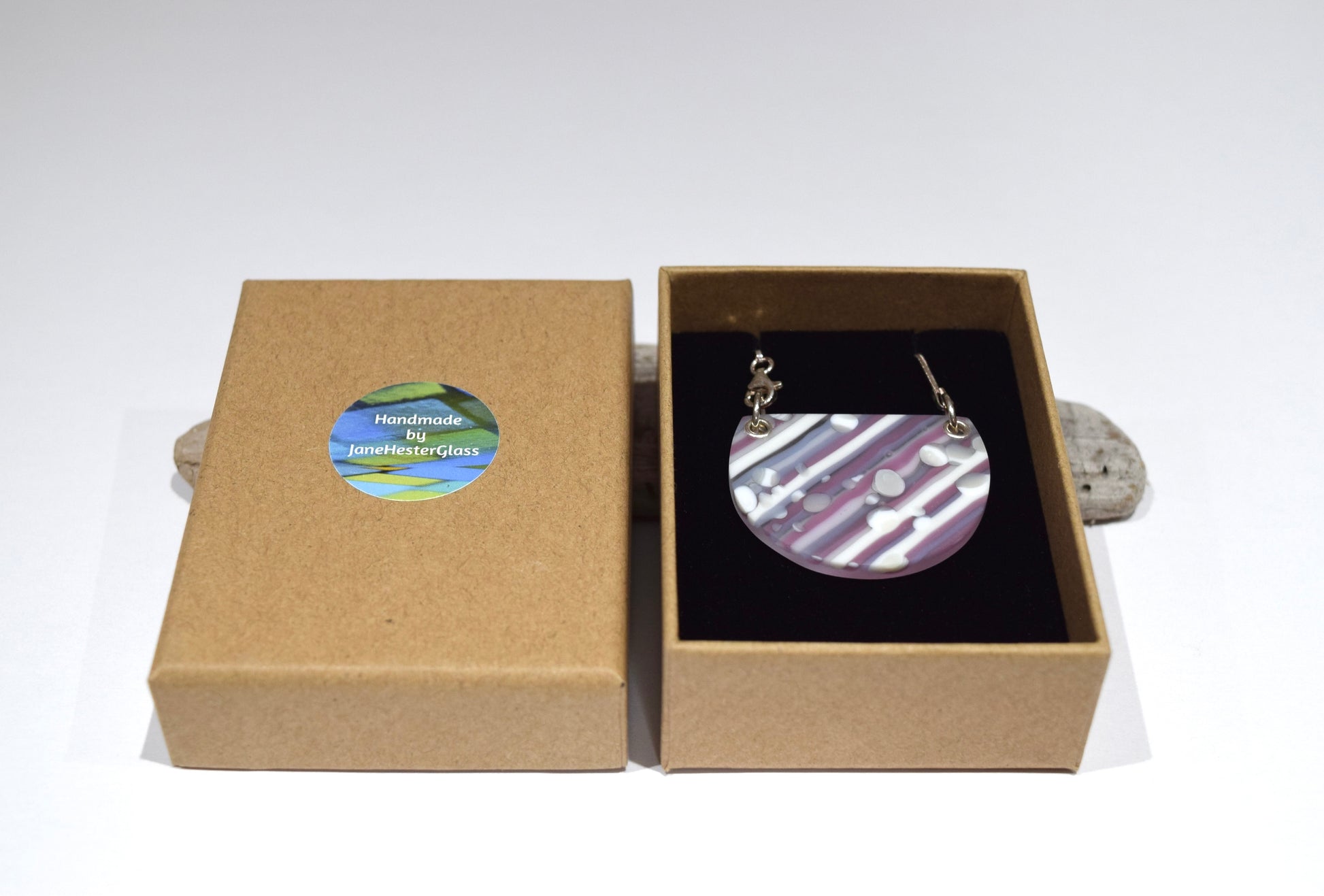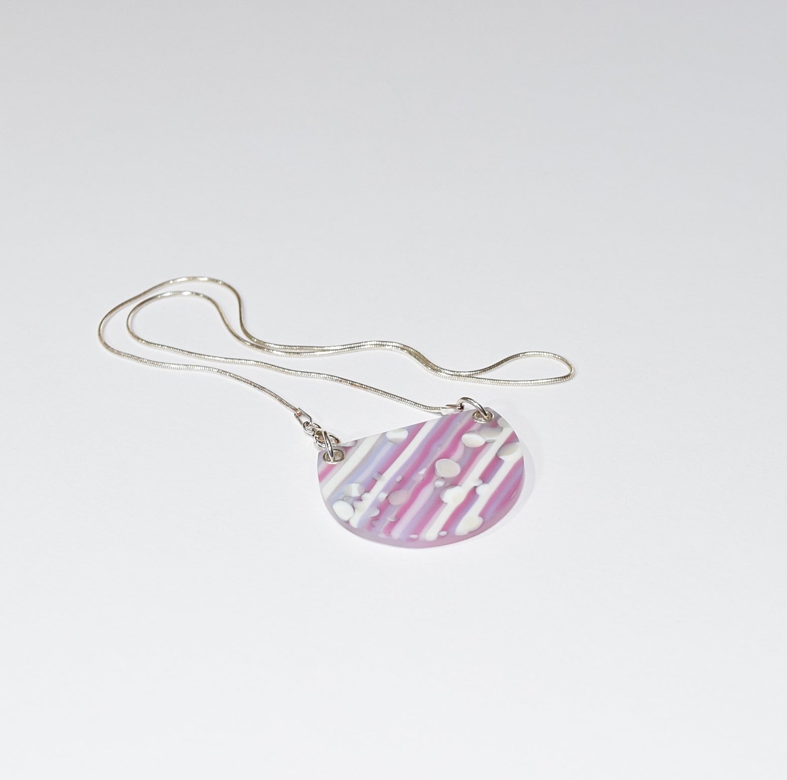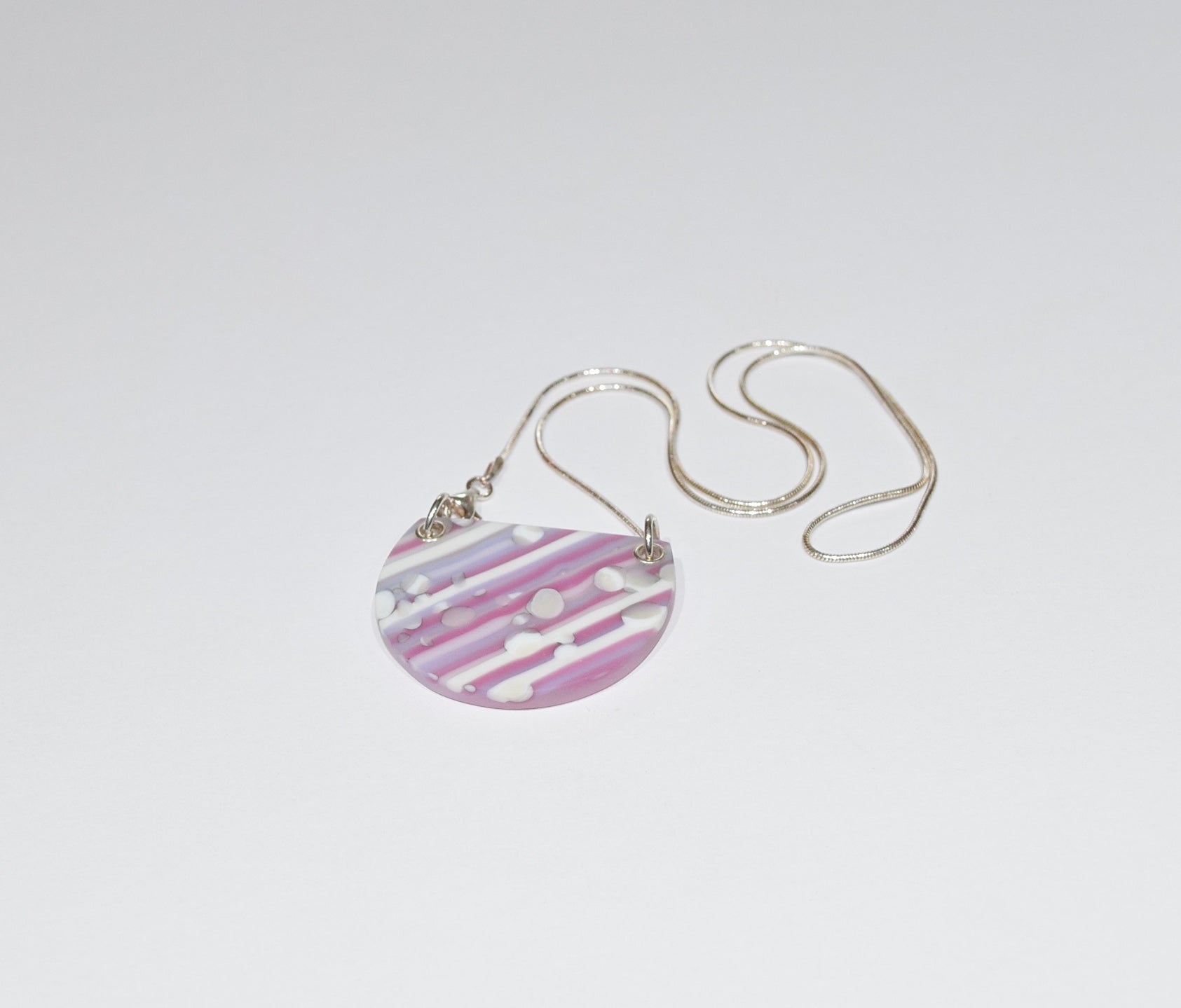 The pattern for this pendant was created and fired beforehand using opal glass stringers and frit. The patterned glass was then hand cut and finished into a semi circle.