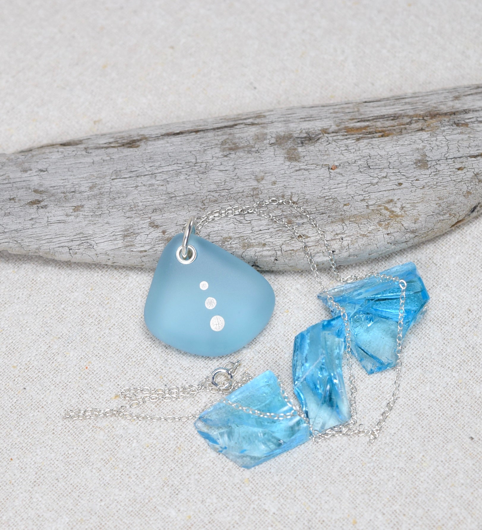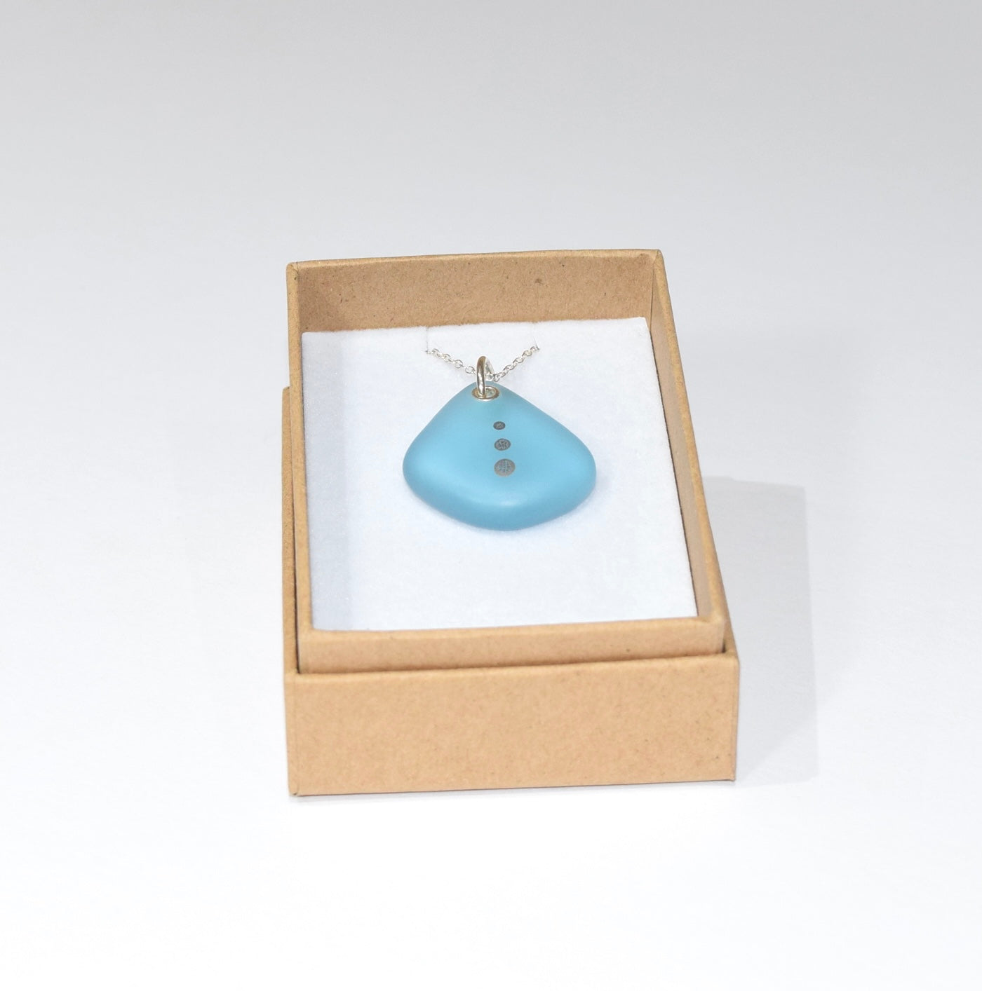 This pale turquoise glass pendant is semi-opaque and has a smooth low sheen finish. It is hand decorated with platinum lustre which is then fused onto the glass; designs vary and each pendant is unique.
