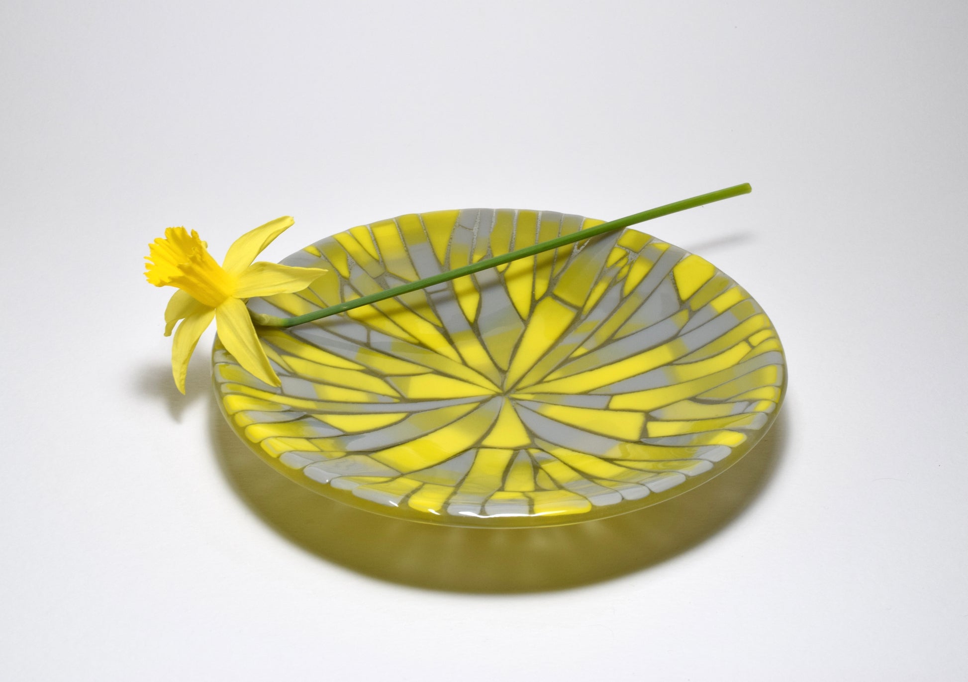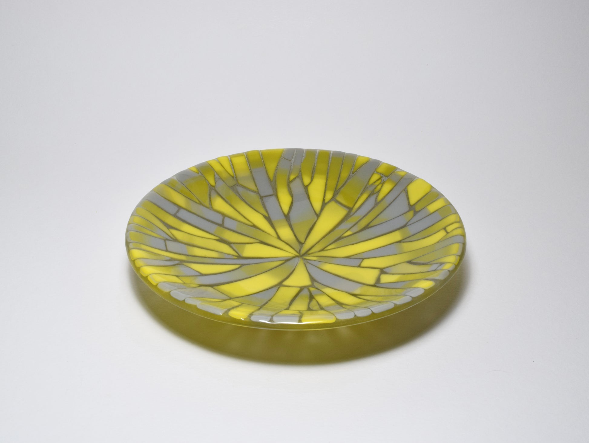 This contrasting yellow and grey round mosaic bowl was made using opal glass. The seams in between the pieces are pale transparent grey.